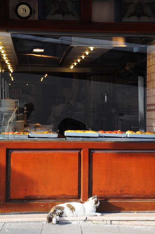 在最熱鬧的街頭,最人來人往的地段,貓大爺在優哉悠哉地一邊享受陽光一邊整理毛髮。她睡在土耳其熱食店外面的石階上,頭上是可以看到美味食物的櫥窗。看到貓咪想橫過行人路過去拍照,欄在我前面的是賣陀螺的小孩,請原諒我實在不想帶走太多身外物,只想拍一下貓咪。
